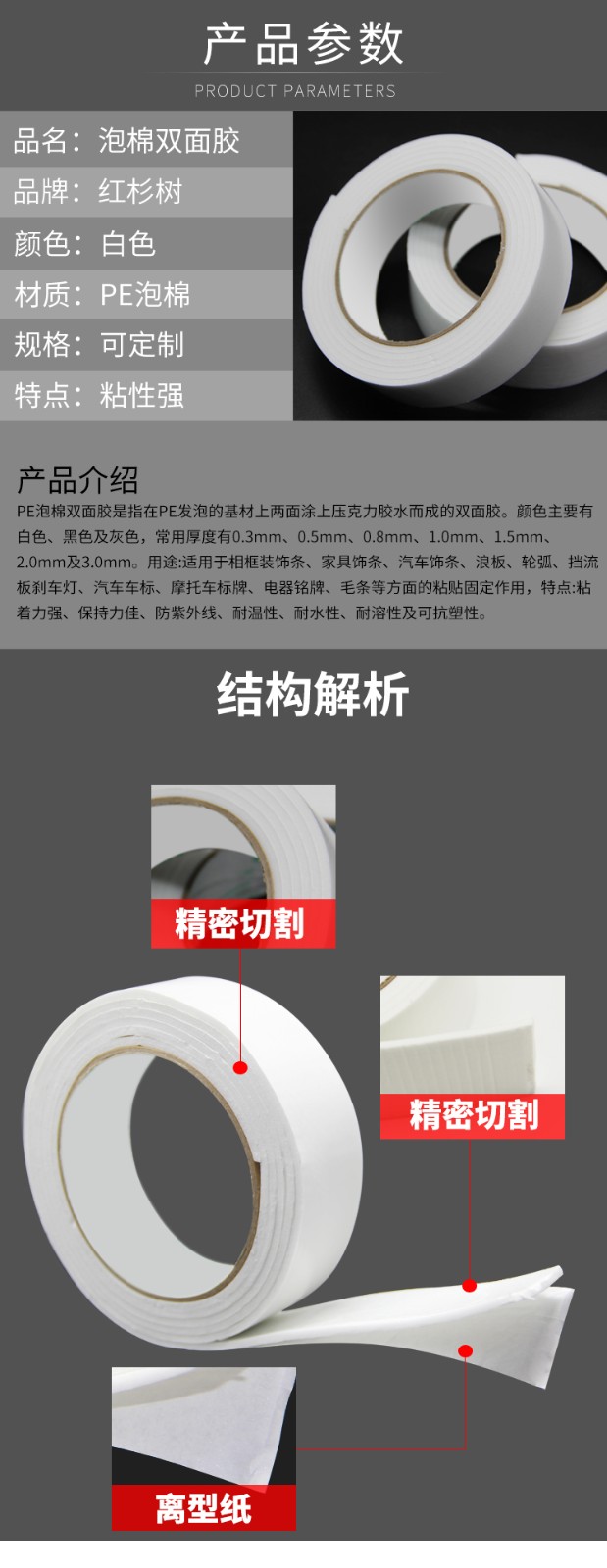- 泡棉雙面膠包括PE泡棉雙面膠、EVA泡棉雙面膠、PU泡棉雙面膠、壓克力泡棉雙面膠等產(chǎn)品介紹泡棉雙面膠是指在發(fā)泡泡棉基材兩面涂上強(qiáng)粘丙烯酸膠粘劑
