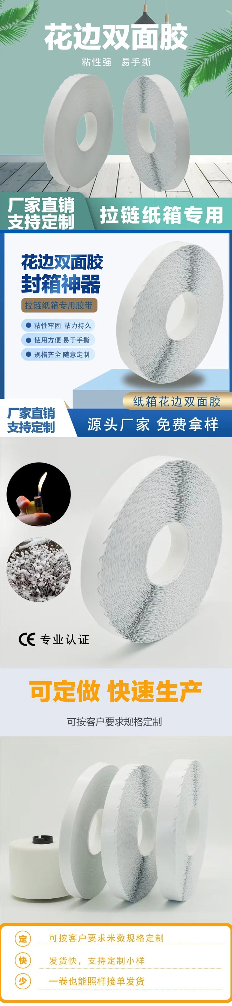 - 波浪紋鋸齒膠帶是以棉紙為基材,在其兩面涂上高粘的感壓性膠水,再覆以易剝的離型材料而成。是一款做了留邊處理定制易于撕拉離型紙貼合的雙面膠帶,400米的大卷更加適合現(xiàn)代流水線自動化設備的粘合。