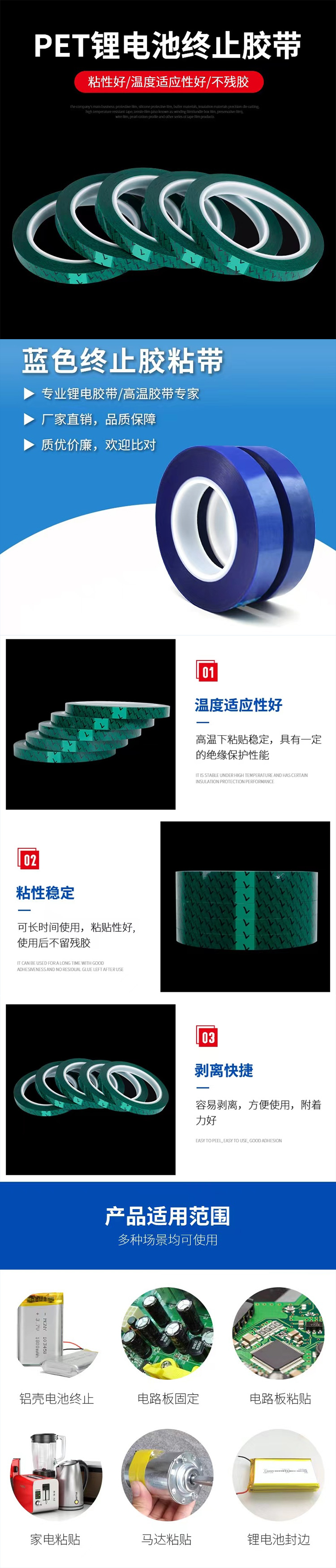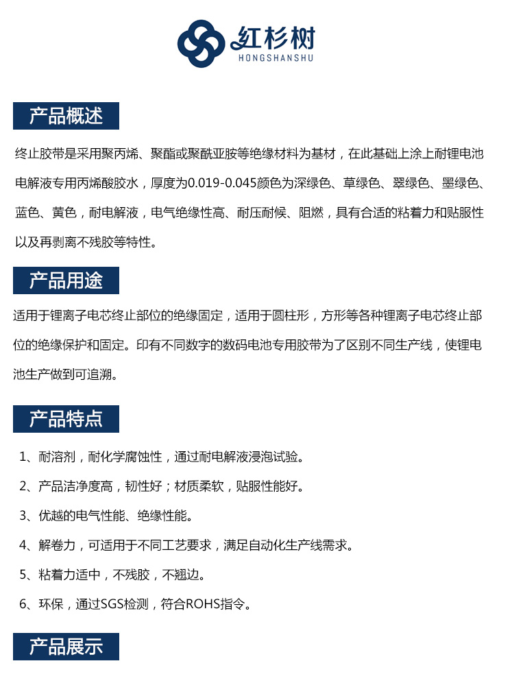 - 終止膠帶是采用聚丙烯、聚酯或聚酰亞胺等絕緣材料為基材,在此基礎(chǔ)上涂上耐鋰電池電解液專用丙烯酸膠水,厚度為0.019-0.045顏色為深綠色、草綠色、翠綠色、墨綠色、藍(lán)色、黃色,耐電解液,電氣絕緣性高、耐壓耐候、阻燃,具有合適的粘著力和貼服性以及再剝離不殘膠等特性。